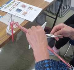 小倉織の歴史と特徴についての説明の後、小倉織(真田紐)のストラップ作りをしました。最初は、織り方に四苦八苦している方もいらっしゃいましたが、みなさま完成後、うれしそうにご自分のストラップを手にされていました。早速、かばんに付けている方もいらっしゃいました。「楽しかった」とのお声に、短い時間でしたが、小倉織に触れていただけ、私たちもうれしかったです。